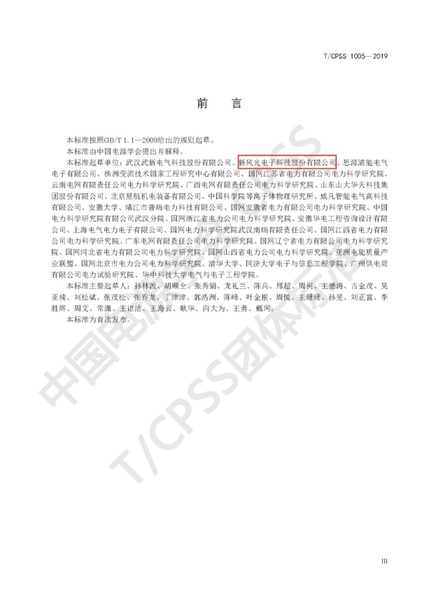 近日獲悉,由中國電源學會組織發(fā)起,新風光電子科技股份有限公司在內的多家知名電能質量治理企業(yè)、科研院所及高校等30家單位共同參與編制的團體標準—《中壓鏈式靜止無功發(fā)生器》T/CPSS1005—2019,于2019年8月1日正式實施。截止目前,新風光公司先后主持并參與了16部國家、行業(yè)及團體標準的起草審定工作。