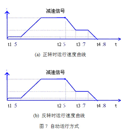 圖7中,以正轉(zhuǎn)為例,開機時低速爬行時間t1、收到減速信號后減速動作時間t2、中速運行時間t3、停機前爬行時間t4根據(jù)現(xiàn)場情況可以自由設置。提升機運行過程中,除開、停機外,可以不需要人工干預。