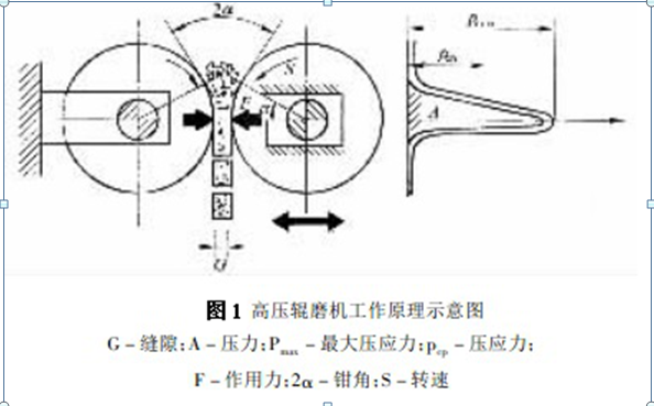 高壓輥磨機主要由給料裝置、料位控制裝置、一對輥子、傳動裝置(電動機、皮帶輪、齒輪軸)、液壓系統(tǒng)、橫向防漏裝置等組成。兩個輥子中,一個是支撐軸承上的固定輥,另一個是活動輥子,它可在機架的內(nèi)腔中沿水平方向移動。兩個輥子以同速相向轉(zhuǎn)動,輥子兩端的密封裝置可防止物料在高壓途徑下從輥子橫向間隙中排出。高壓輥磨機的工作原理如下圖所示。物料由輥壓機上部通過給料裝置(重力或預(yù)壓螺旋給料機)均勻喂入,在相向轉(zhuǎn)動的兩輥的作用下,在拉入角處將物料拉入高壓區(qū)進行粉碎,從而實現(xiàn)連續(xù)的高壓料層粉碎。