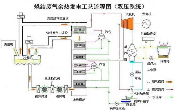 目前,國(guó)內(nèi)燒結(jié)廢氣余熱回收利用主要有三種方式:一是直接將廢煙氣經(jīng)過(guò)凈化后作為點(diǎn)火爐的助燃空氣或用于預(yù)熱混合料,以降低燃料消耗,這種方式較為簡(jiǎn)單,但余熱利用量有限,一般不超過(guò)煙氣量的10%;二是將廢煙氣通過(guò)熱管裝置或余熱鍋爐產(chǎn)生蒸汽,并入全廠蒸汽管網(wǎng),替代部分燃煤鍋爐;三是將余熱鍋爐產(chǎn)生蒸汽用于驅(qū)動(dòng)汽輪機(jī)組發(fā)電。