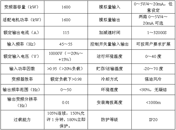 表2 山東新風(fēng)光JD-BP38-1600F高壓變頻器技術(shù)參數(shù):