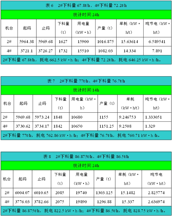 為了進一步測試節(jié)能效果,分別統(tǒng)計2#、4#焙燒爐在不同下料量的情況下,除塵ID風(fēng)機的耗電量,統(tǒng)計數(shù)據(jù)如表6、表7、表8所示。