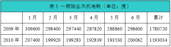 以焦炭除塵風(fēng)機(jī)消耗電量來分析節(jié)能效果,根據(jù)旭陽公司生產(chǎn)統(tǒng)計(jì)報(bào)表,2009年1~6月同2010年1~6月相比,焦化廠2009年上半年焦炭產(chǎn)量為438020噸,2010年上半年焦炭產(chǎn)量為439334噸,產(chǎn)量基本相同,統(tǒng)計(jì)除塵風(fēng)機(jī)消耗電量如下表5所示: