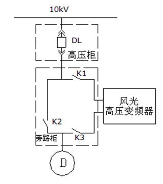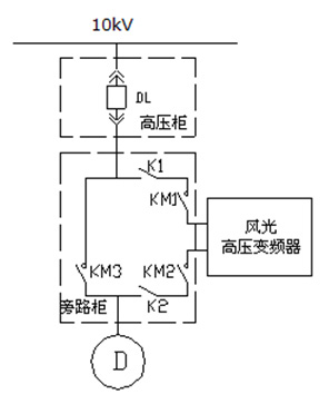 旁路柜主要配置:三個(gè)高壓斷路器(KM1、KM2、KM3)和兩個(gè)刀閘隔離開關(guān)K1、K2。KM2與KM3實(shí)現(xiàn)電氣互鎖,當(dāng)KM1、KM2閉合,KM3斷開時(shí),電機(jī)變頻運(yùn)行;當(dāng)KM1、KM2斷開,KM3閉合時(shí),電機(jī)工頻運(yùn)行。另外,KM1閉合時(shí),K1操作手柄被鎖死,不能操作;KM2閉合時(shí),K2操作手柄被鎖死,不能操作。