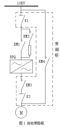 根據(jù)用戶現(xiàn)場的實際情況,旁路柜采用了一拖一工變頻自動轉(zhuǎn)換方案。如圖1所示。旁路柜中,共有2個高壓隔離開關(guān)和2個真空接觸器,為了確保不向變頻器輸出端反送電,KM3與KM4采用電氣互鎖。當K1、K3、KM1和KM3閉合,KM4斷開時,電機變頻運行;當KM1、KM3斷開,KM4閉合時,電機工頻運行,此時變頻器從高壓中隔離出來,便于檢修、維護和調(diào)試。
