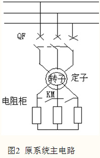 原系統(tǒng)是采用繞線電機(jī)串電阻降壓啟動,然后全壓運行的方式進(jìn)行控制的,如圖2示。