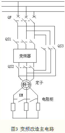 變頻改造后的系統(tǒng)主電路如圖3示,從變頻器的輸入隔離開關(guān)QS1、輸出隔離開關(guān)QS2各取一對動斷觸點串入電阻柜內(nèi)接觸器KM的合閘回路,保證變頻啟動時切除電阻啟動。