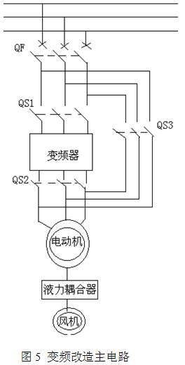 變頻改造后主電路如圖5示,把變頻器串在原系統(tǒng)的高壓真空斷路器與電動機(jī)之間,采用三個隔離開關(guān)進(jìn)行工變頻轉(zhuǎn)換。變頻運行時閉合QS1、QS2,斷開QS3,工頻運行時閉合QS3,斷開QS1、QS2,QS2與QS3在電氣、機(jī)械方面雙互鎖,保證電氣回路的安全。考慮到變頻器調(diào)試期間的穩(wěn)定性,先保留液力耦合器,變頻運行時將液力耦合器調(diào)到最大。