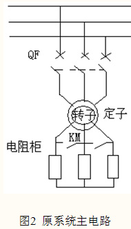 原系統(tǒng)是采用繞線電機串電阻降壓啟動,然后全壓運行的方式進行控制的,如圖2示。