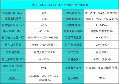 JD-BP38-630F高壓變頻器技術(shù)參數(shù)如表1所示。