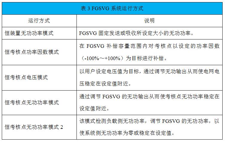 運行方式包含了五種:恒裝置無功功率模式、恒考核點無功功率模式、恒考核點功率因數(shù)模式、恒考核點電壓模式、恒考核點無功功率模式2。由下拉框選定,并于右側(cè)設(shè)定目標值,目標值可隨時更改,更改后可根據(jù)檢測值檢查補償效果。如表3所示,對“運行方式”進行了詳細說明。