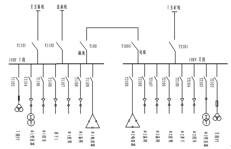 某煤礦礦井供電系統(tǒng)采用10kV雙回路供電,主供線路來自新玉35kV變電站10kV出線,備用線路來自自備電廠35kV直供站10kV直新線。井下中央變電所安裝KBSG-630/10變壓器兩臺,供電電壓660V,其供電系統(tǒng)如圖3所示。
