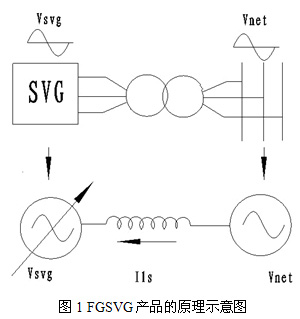 FGSVG產(chǎn)品的原理示意圖如圖1所示,基本原理就是將自換相橋式電路通過(guò)變壓器或者電抗器并聯(lián)在電網(wǎng)上,適當(dāng)?shù)卣{(diào)節(jié)橋式電路交流側(cè)輸出電壓的幅值和相位,或者直接控制其交流側(cè)電流就可以使該電路吸收或者發(fā)出滿足要求的無(wú)功電流,實(shí)現(xiàn)動(dòng)態(tài)無(wú)功補(bǔ)償?shù)哪康摹?/p>
