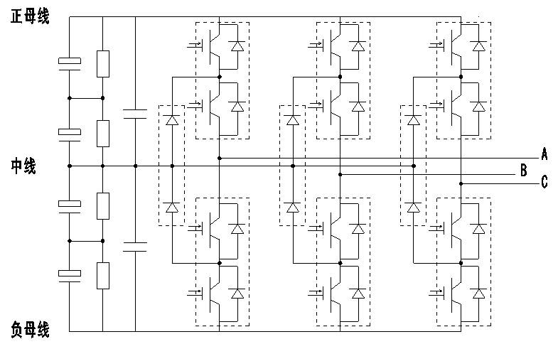 逆變單元的主要作用是把系統(tǒng)瞬間剎車積聚的能量逆變成與電網(wǎng)電壓同步的交流電回送至電網(wǎng)。目前地鐵牽引供電系統(tǒng)電壓一般有兩個(gè)電壓等級(jí)即直流750V和1500V,逆變主電路采用二極管箝位三電平電路拓?fù)?。主電路拓?fù)淙鐖D3所示。
