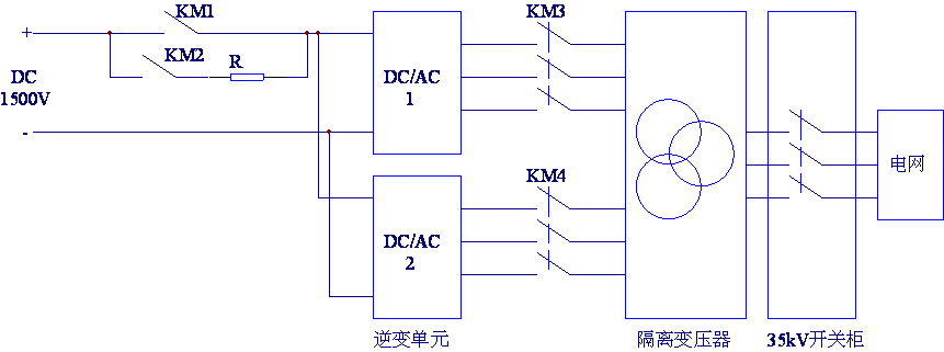 逆變單元輸出交流電壓1000V/500V,經(jīng)隔離變壓器接到35kV/10kV/400V電網(wǎng)。